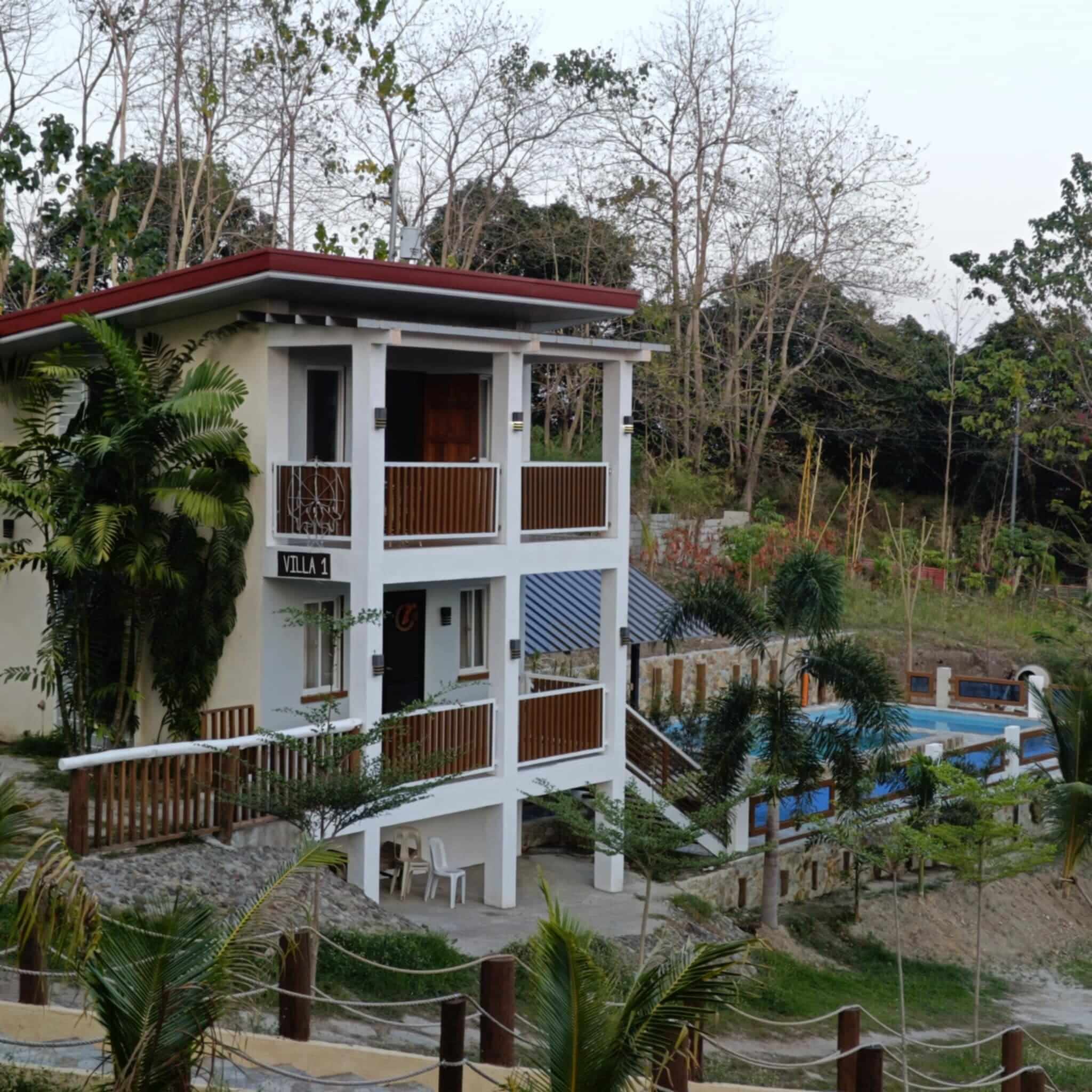 Villa 1 (Loft-type) – P14,000 (Mon-Fri); P16,000 (Sat-Sun & holidays) includes PRIVATE POOL, 2 bedrooms & living room, beds, aircons, videoke, stove & grill, refrigerator, table and chairs, private CR and shower, & entrance fee waived for up to 15 pax.